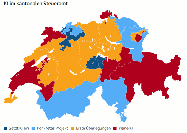 Die Grafik zeigt auf, welche Kantone heute bereits mit künstlicher Intelligenz in den Steuerverwaltungen arbeiten und welche noch hinterher hinken. Auch Glarus ist noch rot.